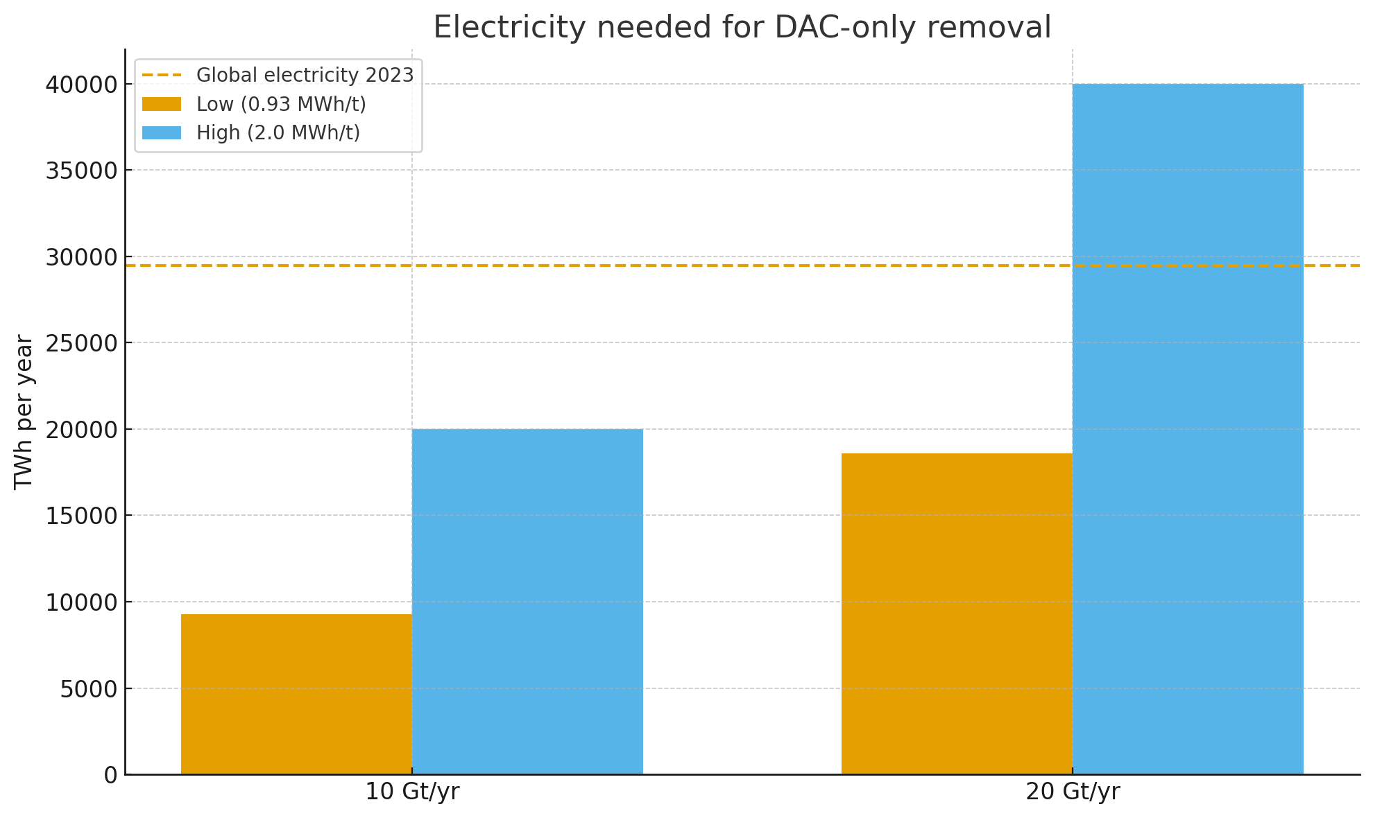 10 Gt/yr: ~9,300–20,000 TWh/yr, i.e. 32–68% of all 2023 global electricity (≈29,471 TWh). Ember Energy+2PMC+2